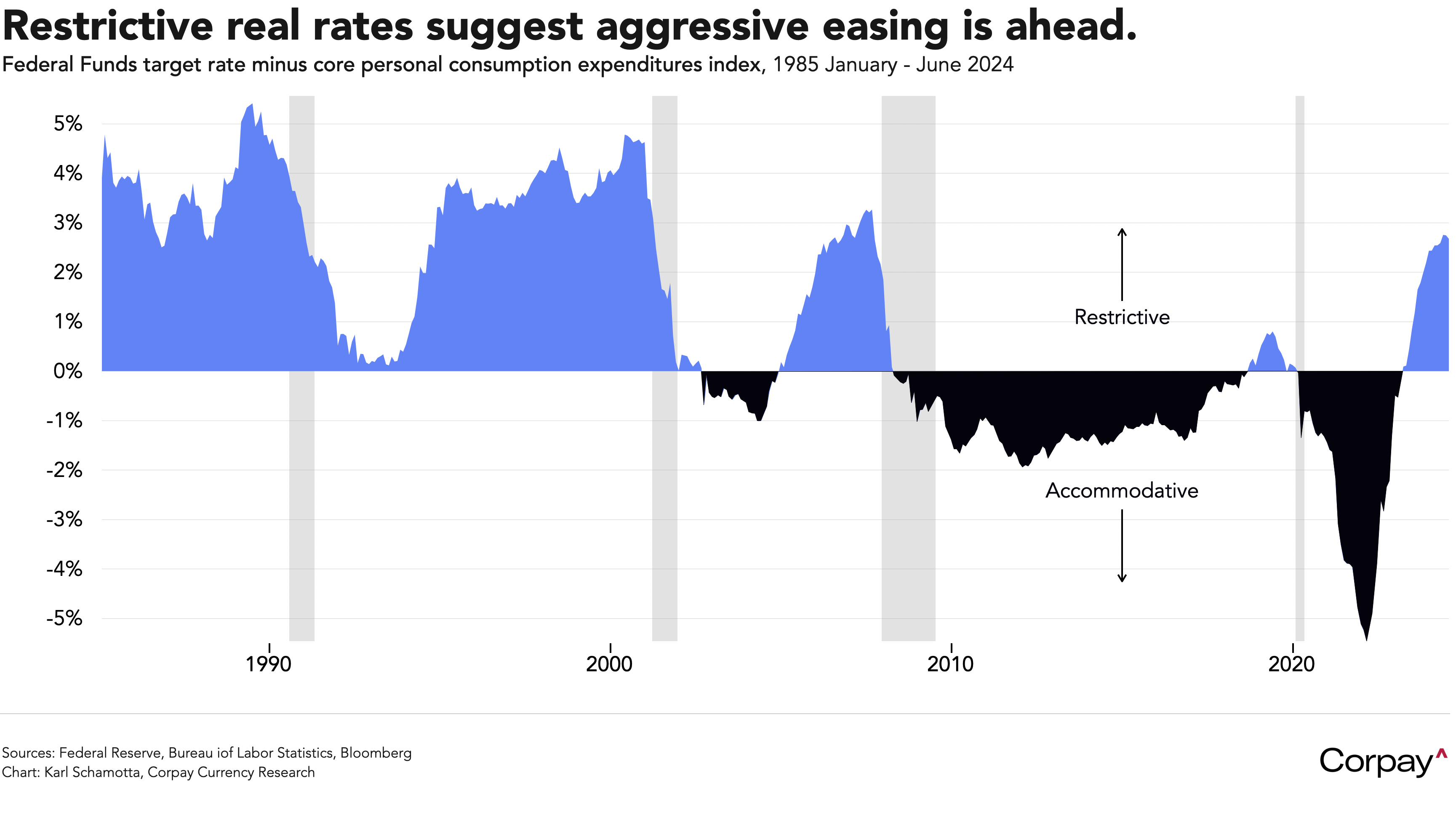 Jerome Powell could provide clearer easing guidance during next week’s appearance in Jackson Hole, Wyoming. The agenda for the Kansas City Fed’s annual Economic Policy Symposium hasn’t been made public yet, but if the chair appears, he is widely expected to further shift his communications emphasis toward the second half of the central bank’s mandate, highlighting downside risks to employment and doubling down on previous assertions about the “restrictiveness” of current policy settings. If consensus estimates are correct, the core personal consumption expenditures deflator will print close to the 2.7 percent mark upon release later this month, 2.675 percent lower than the midpoint of the current Fed Funds target range, implying the highest level of “real” rates since the run-up to the 2008 global financial crisis.