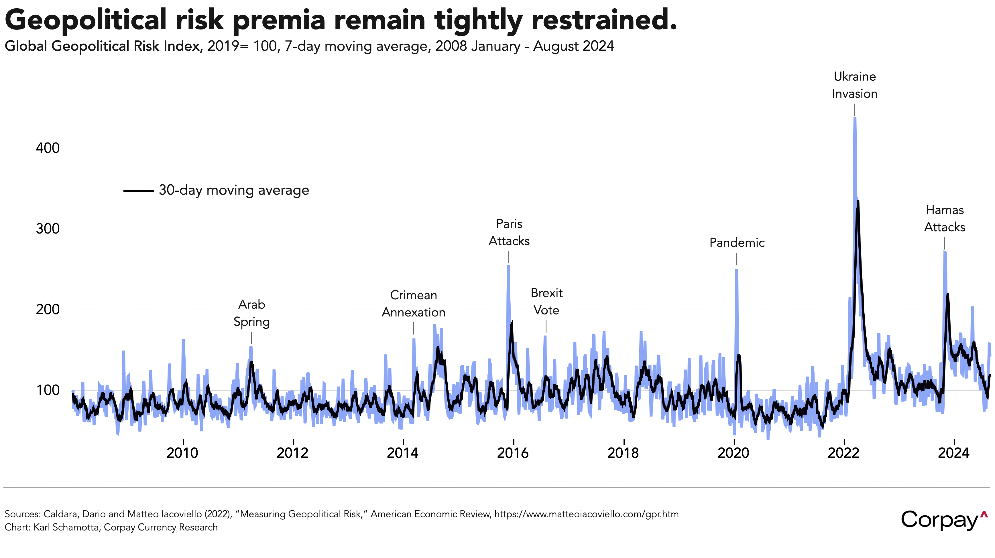 Crude oil benchmarks remain surprisingly quiescent, suggesting that the “geopolitical tensions” mooted in many sell-side research reports are having little to no effect on underlying market assumptions. Measures of geopolitical risk look elevated relative to long-term averages, but oil markets seem well-insulated, with seasonal demand growth fading, the Chinese economy generating below-trend growth, and the United States producing at near-record levels. Both the Brent and West Texas Intermediate price gauges are up less than 2 percent on the month, despite the threat of an Iranian strike on Israel in the coming days or weeks. This may not last.