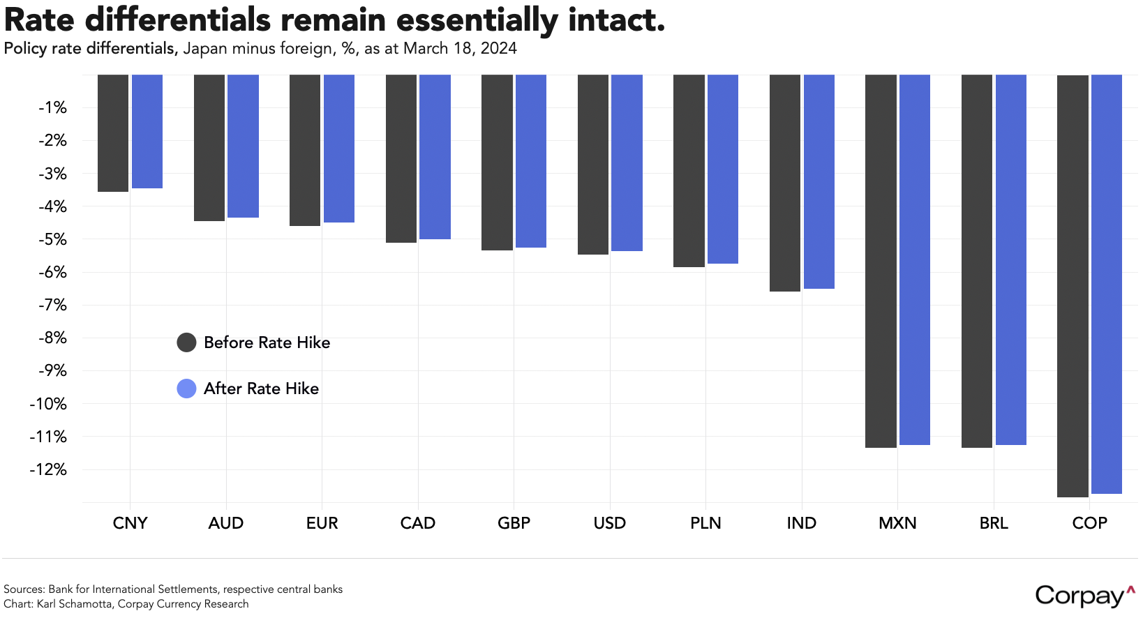 The Bank of Japan ended a decades-long experiment with unconventional monetary policy last night, and markets shrugged. Policymakers voted by a 7-2 margin to lift the key target for short-term rates to a range of 0-to-0.1 percent, stop capping the yield on 10-year government bonds, and end purchases of assets such as stocks, real-estate investment trusts and corporate bonds. In a press conference, Governor Kazuo Ueda noted that the Bank expects to achieve the 2-percent inflation target within two years, but that it would keep buying bonds in an effort to keep yields stable, saying “Accommodative financial conditions will likely continue, and these accommodative financial conditions will firmly support the economy and prices”. The decision, which was widely expected, resulted in a weakening currency as traders took profits and bet on a continuation of the “carry trade” in which speculators borrow yen and invest in higher yielding jurisdictions elsewhere. We expect the exchange rate to appreciate modestly in coming months as other major central banks begin to ease, but policy rate differentials between Japan and other countries remain vast.