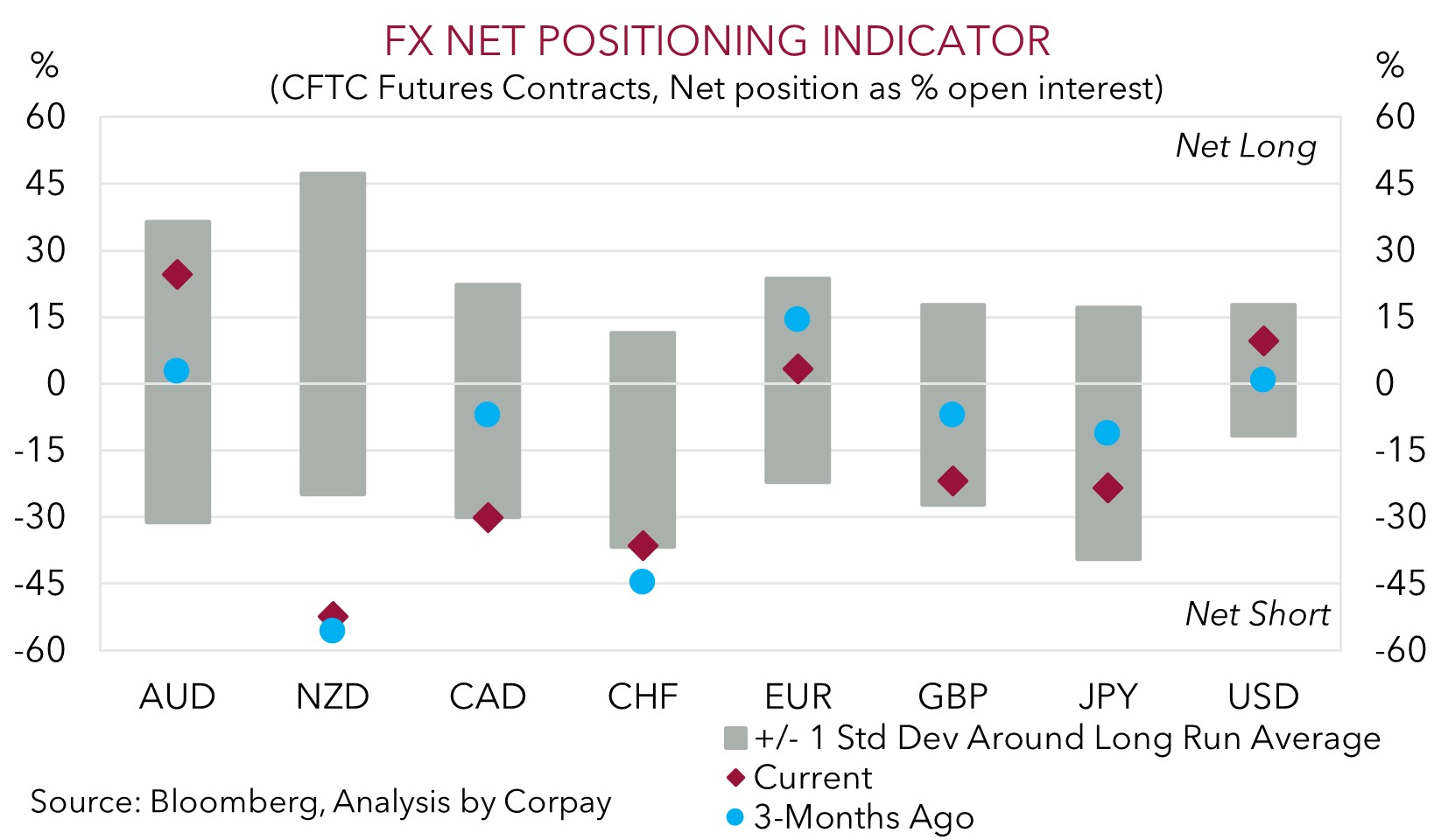For the AUD, global forces, especially events in the Middle East, and swings in risk sentiment will remain in the driver’s seat. As discussed, the effects on the global economy, particularly on activity across Asia, are still in their infancy. In our judgement, based on how much more RBA tightening is already baked into the Australian interest rates curve (another ~51bps of hikes are priced in by year-end), the global growth headwinds, and with negative domestic consequences of higher mortgage rates and fuel costs in the pipeline, the AUD could struggle to add to recent gains. Especially as a lot of ‘good news’ already looks factored in given the AUD is tracking ~1.5-2.0% above our ‘fair value’ estimates and positioning (as measured by CFTC futures) is ‘net long’.