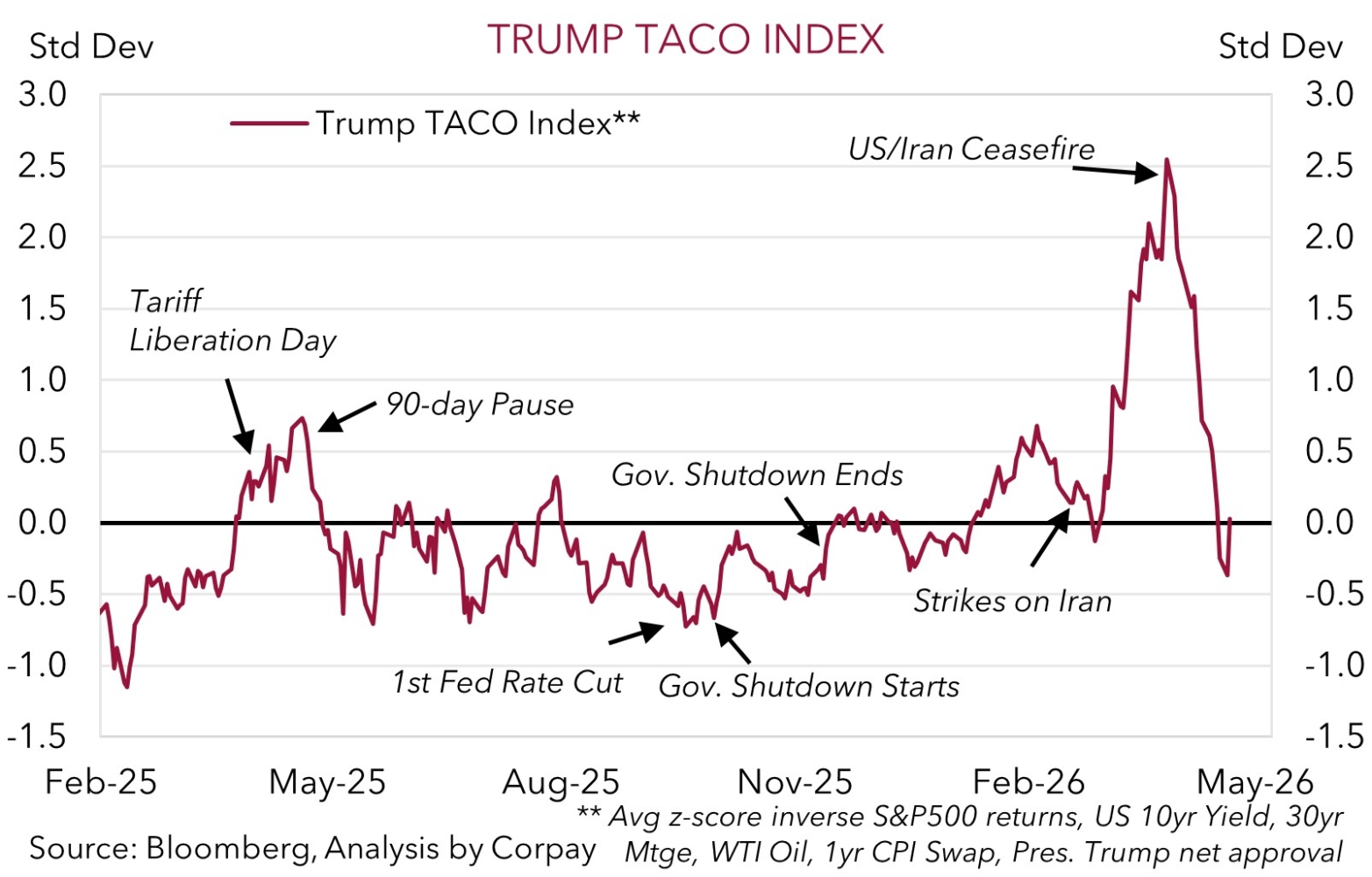 NZD held up against the USD (now ~0.5892) due to higher than anticipated NZ CPI. NZ headline inflation held steady at ~3.1%pa in Q1, above consensus and the RBNZ’s forecasts. Notably, the March quarter figures only partially captured Middle East impacts, with those forces set to push NZ inflation higher in Q2. Given the signals from pricing intentions in business surveys and other possible second round effects we think the risk of inflation becoming embedded across the NZ economy is increasing. This in turn points to the RBNZ needing to shift interest rate settings out of ‘accommodative’ territory and back towards ‘neutral’ later this year. A move as soon as the 27 May meeting can’t be ruled out. Markets are fully discounting a RBNZ rate rise by the July meeting, with ~115bps of hikes factored in by Q1 2027. We believe that an RBNZ rate hiking cycle, and assumption energy flows via the Strait of Hormuz eventually begin to normalise, could be tailwinds for the beaten down NZD. Particularly as NZD/USD is tracking ~2-3 cents below our model estimates, and AUD/NZD ‘fair value’ is estimated to be closer to ~1.18.