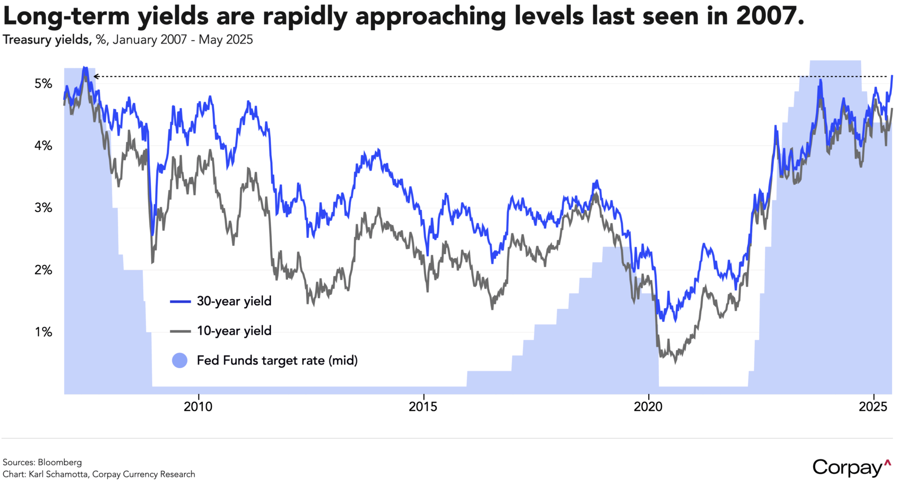 Treasury markets are extending their losses this morning on worries that funding strains could reach unsustainable levels after the House of Representatives passed President Donald Trump’s broad-reaching tax-cut bill. By a 215-to-214 margin, the lower chamber passed what Trump has called his “one, big, beautiful” bill early this morning, with two Republicans and all Democrats voting against it. The 30-year Treasury yield is closing on the 5.15-percent threshold, nearing levels only temporarily breached during the Fed-induced selloff in 2023, and previously touched in 2007. The dollar giving back some of its overnight gains, and most of its major counterparts are holding steady as traders await new catalysts.