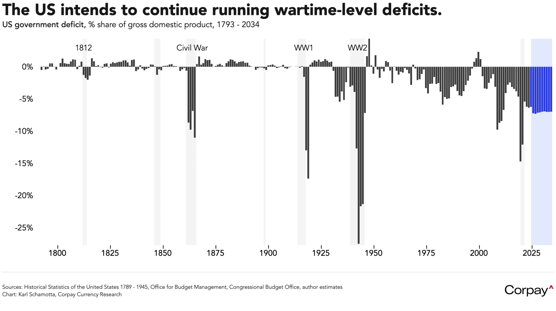 In the short term, the legislation should have a stimulative effect on the US economy. The bill proposes to extend 2017’s tax cuts and add new ones, while boosting outlays on border security, national defence, and farm support programmes, even as it imposes smaller cuts to Medicaid and nutrition assistance. Updated projections are not yet available, but on net, our estimates* suggest that the “fiscal impulse” – the contribution of fiscal policy to gross domestic product growth – could turn modestly positive in the next fiscal year as less than $175 billion of spending cuts are offset by $750 billion in new borrowing. On the trajectory established under previous governments – both Republican and Democratic – and reinforced by this morning’s bill, the US is highly likely to continue running deficits that are typical of wartime conditions in the decade ahead, driving debt-to-gross domestic product ratios to unprecedented levels.