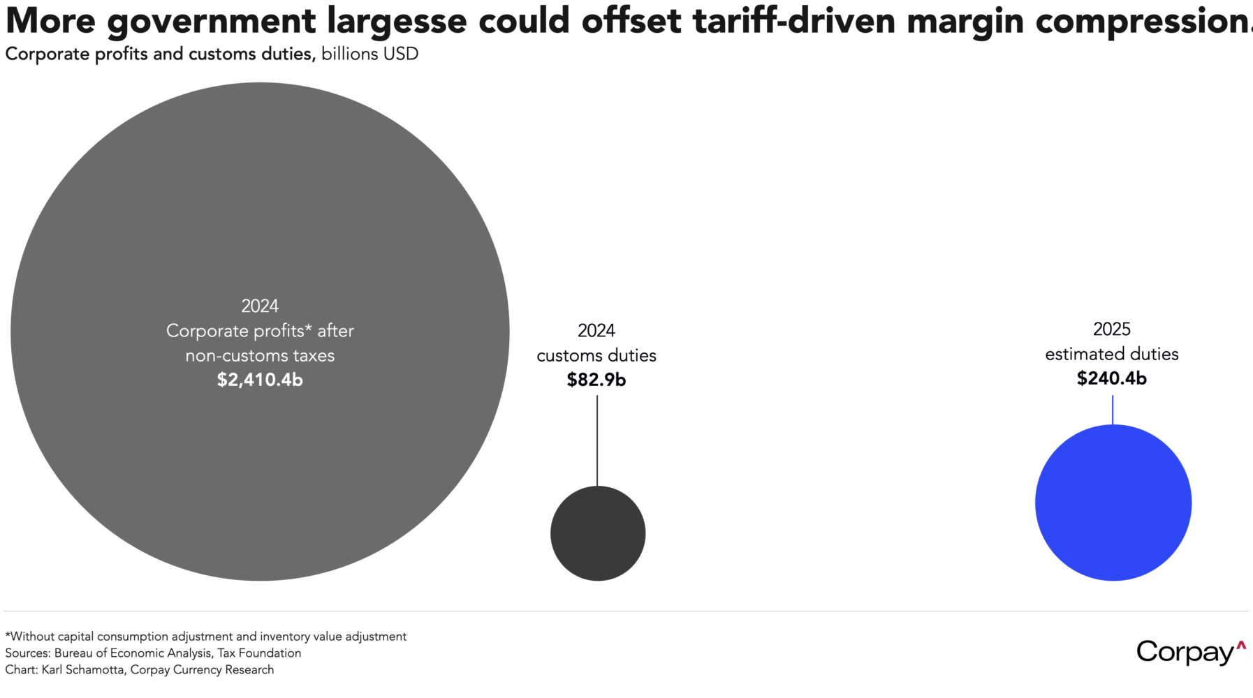 In a sense, this might partially offset weakness in the corporate sector as tariff increases hit profit margins. As a slew of earnings reports have recently shown, America’s largest companies are bracing for a downturn ahead as abysmal consumer confidence levels translate into weaker revenue growth, economic uncertainty impacts growth and investment plans, and tariffs at current levels take a serious toll on profit margins. More government spending and lower taxes might help alleviate the broader economic effects and keep profits aloft for now.