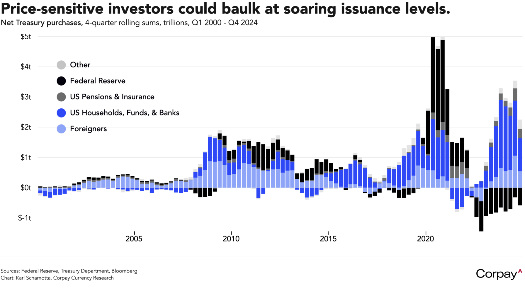 But investors are growing increasingly wary of funding a country that has seemingly abandoned any pretence of maintaining fiscal discipline. Marginal Treasury demand has been gradually shifting away from price-insensitive holders, such as the Federal Reserve, pension funds, and insurers, toward more sensitive buyers, like households, investment funds, and foreign private sector investors in recent years, and signs of stress are repeatedly emerging. Yesterday, a routine auction for 20-year debt saw yields pop to 5.014 percent – well above the recent 4.6-percent average – as demand from domestic buyers softened.